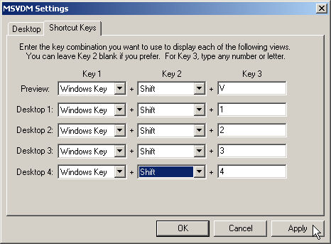 . . . but doing so might conflict with any macro (or other) programs you have installed but I can find no way to disable the hotkeys for the desktop manager, so what I do is assign really awkward key combinations so it's unlikely I'll ever press them accidentally.
